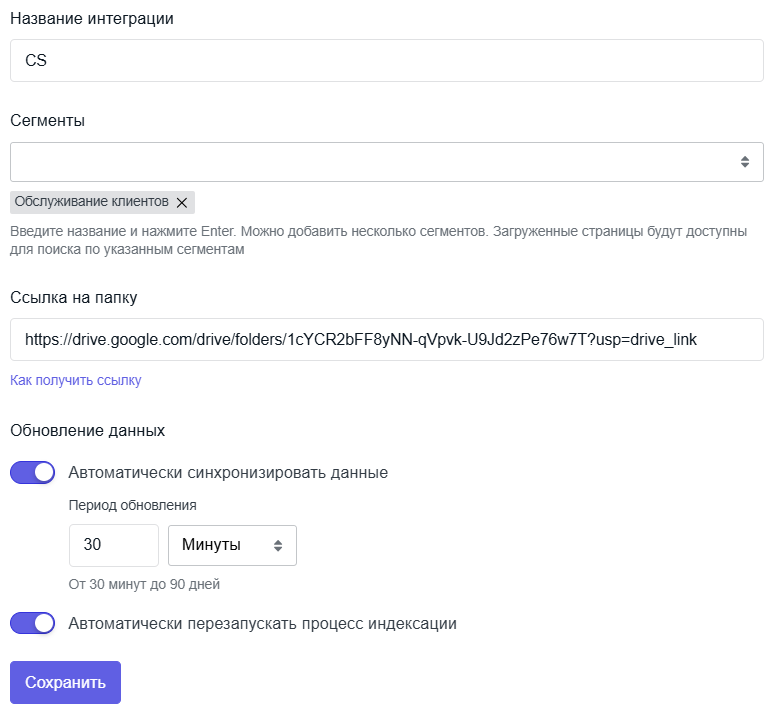 Интеграция позволяет загружать данные из папки Google Диска в базу знаний, автоматически синхронизировать и переиндексировать их.
